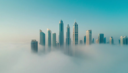 Foggy cityscape with skyscrapers, 3d render