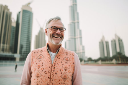 Happy man winner against the backdrop of Dubais skyscrapers.