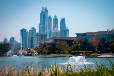 Town scape at summer. Panoramic scene, Dubai. Water Fountain lake famous place to visit in Dubai travel and Tourist attraction