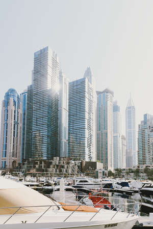 Dubai; UAE - June 6, 2020: Skyscrapers, yachts and boats at Dubai Marina. City view through artificial water canal
