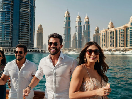 Attractive traveler man walking on a promenade in Dubai Marina district. Travel destinations and tourist lifestyle in UAE