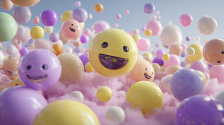 Smiling spheres of varying colors and sizes hover above a fluffy, pastel background, creating a whimsical and cheerful scene in daylight.