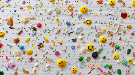 A lively collection of small objects and decorations spread across a white surface, ideal for creative projects, crafts, and joyful designs.