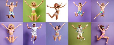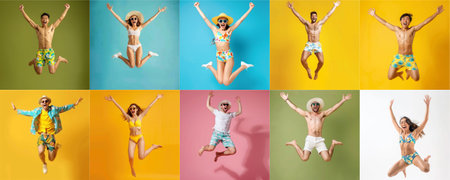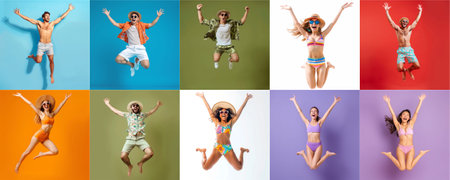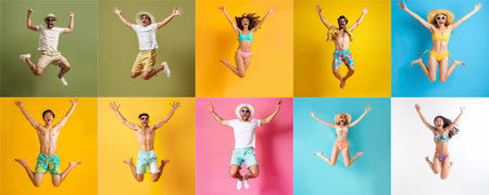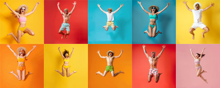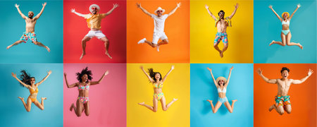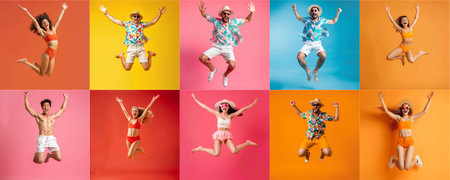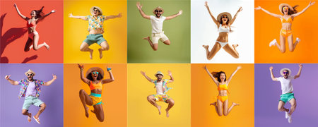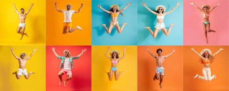 Summer people collection set, diverse people jumping on colorful background, many people funny jump wearing summer outfit fashion ready for swim and summer activity, summertime, beachwear AIG48