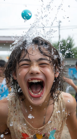 Captivating close-up image of a young person as water splashes across their face, capturing a moment of joy and refreshment with vibrant details.