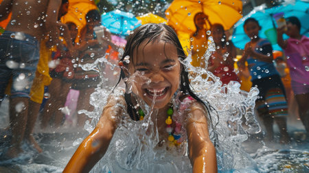 Maha Songkran, World Water Festival, Celebrate Thai New Year, Songkran day Thailand concept. Happy people splashing water. Generative ai.