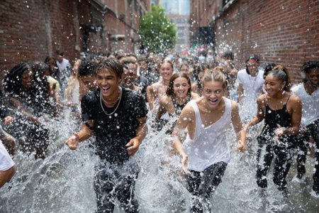 Groups of young individuals playfully splash each other in a narrow alley filled with water on a sunny day.