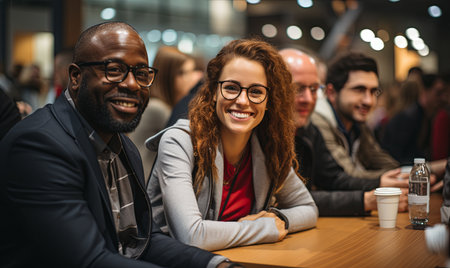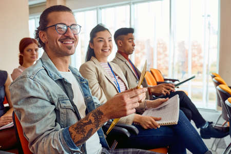 Young participants are enjoying while following a business lecture in a pleasant atmosphere in the conference room. Business, people, company