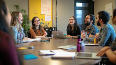 A group of entrepreneurs gathered around a table, sharing jokes and laughing together, A group of entrepreneurs laughing together at a joke during a meeting