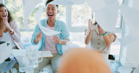 Group of business people finish job done throwing paper work and dance with happiness. Diversity people dance, fun, joy, happy promotion employment having good news. Man look at camera dancing happy
