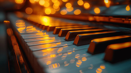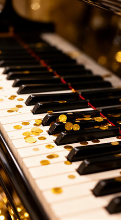 Golden confetti on piano keys reflecting celebration and music. That the image is generated using AI.