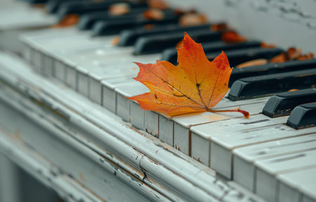A close-up shot of an orange leaf resting on the black and white keys of a piano.