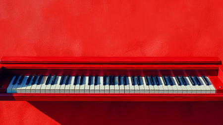 Top view of multicolored piano keys. Close-up of piano keys. Close frontal view. Piano keyboard with selective focus. Top view. Colorful Piano keyboard perspective with red button. Soft lighting