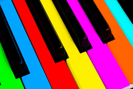 Close-up of piano keys with colorful neon lighting, artistic music instrument concept