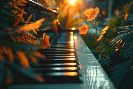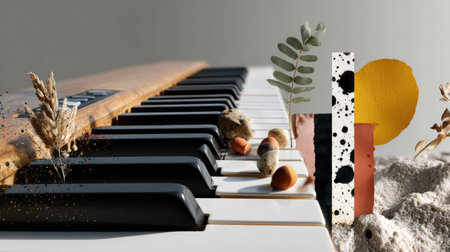 This image showcases a beautifully arranged piano keyboard with various natural elements, textures, and colorful shapes. It embodies creativity and artistry.