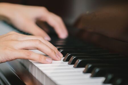 Scene of pianist finger press on the keypad piano, Photo in warm tone colors. Selective focus.