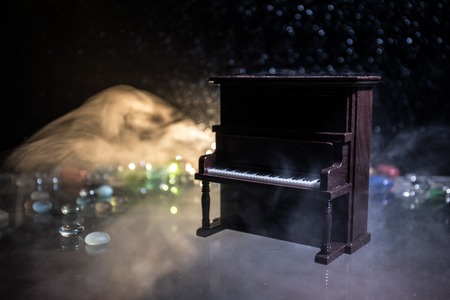 Creative concept. Artwork decoration with piano on dark toned foggy background with light. Selective focus