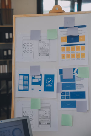 Close up ux developer and ui designer use augmented reality brainstorming about mobile app interface wireframe design on desk at modern office.Creative digital development agency
