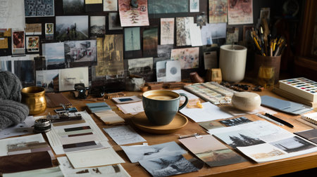 Cozy workspace with creative materials and a cup of coffee on a wooden table