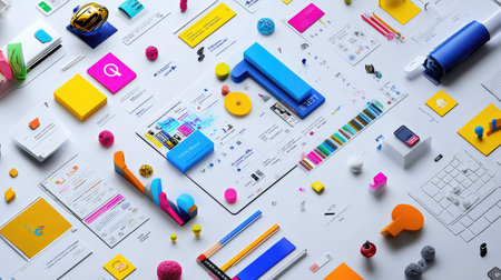 A vibrant and artistic overhead view of an organized workspace featuring colorful office supplies, digital mockups, and creative tools to inspire design.
