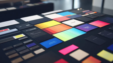 This image showcases an arranged collection of colorful business cards and invitation cards, highlighting various design elements and vibrant color swatches in a modern setting.