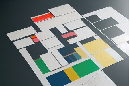 Bright and engaging flat lay of various colorful charts, graphs, and documents set against a bold yellow background, perfect for illustrating business concepts and creative projects.
