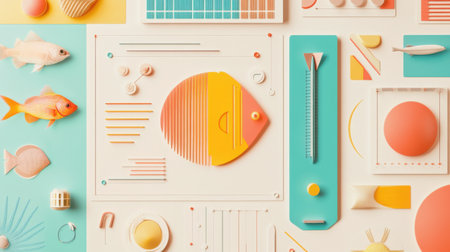 A vibrant arrangement of geometric shapes, fish, and playful elements creates an engaging composition. The colors and layout invite a sense of whimsy and creativity.