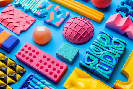 A collage displays various geometric shapes and colored text elements, demonstrating artistic expression and design creativity.