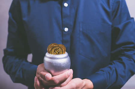 Retired person holding a jar full of Australian currency coins that he saved for a rainy day.