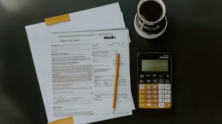 A close-up view of an office workspace featuring a document alongside a pen and calculator, with a coffee cup to enhance focus and productivity.