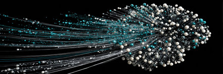 Vibrant 3D artwork showcases a burst of spheres connected by flowing lines, illustrating motion and energy against a black backdrop.