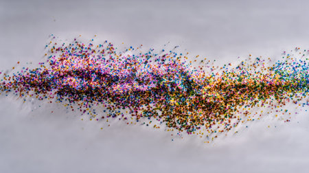 Vibrant, abstract design formed by numerous small, multicolored particles, creating a streaked, confetti-like pattern against a light gray background. The particles are varied in shade and hue, and their arrangement suggests a sense of movement or dispersion.