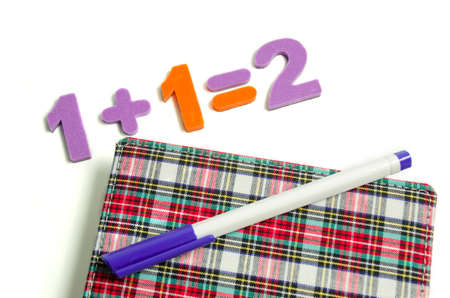 The equation of colored numbers next to a notepad in a cage and a ballpoint pen
