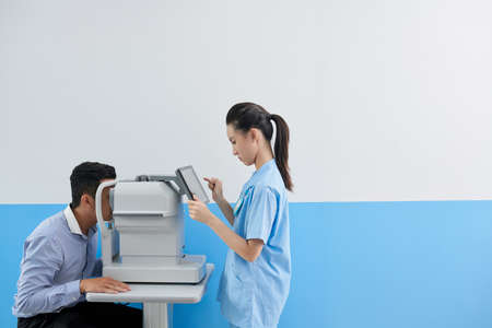 Ophthalmologist using medical equipment, appointment at the hospital