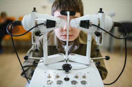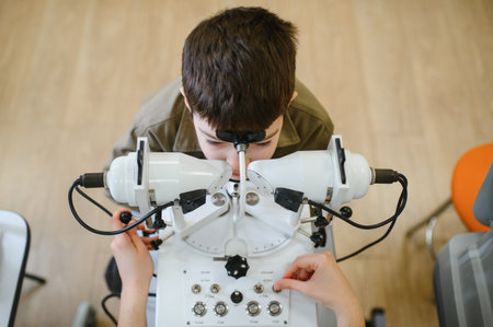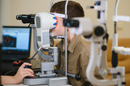 Boy undergoing eye examination using advanced diagnostic equipment operated by ophthalmologist in clinic, ensuring accurate vision assessment and treatment