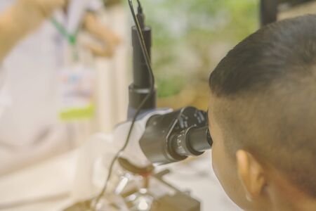 Student learn to use microscope in the science lap at school. Learning and education of kid.