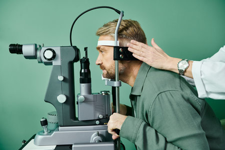 Hard working doctor examines mans eyes through a microscope in a doctors office for laser vision correction.