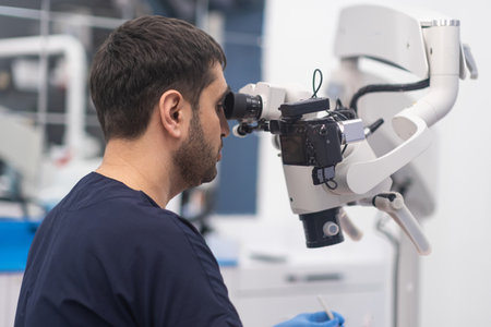 Male Dentist works with microscope. Close up side view.
