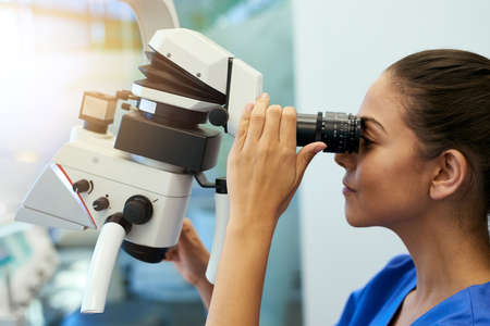 Taking a closer look. Shot of a young pathologist looking at samples under a microscope.