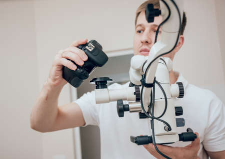 Microscope with photo camera in the dental office. Modern medical technology
