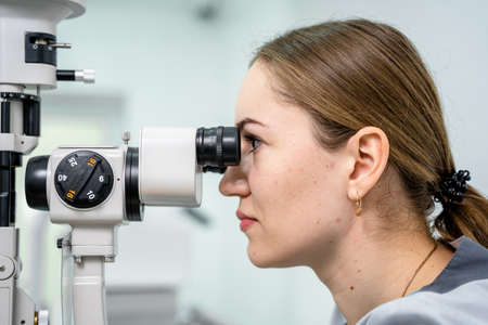 An adult girl at an ophthalmologists appointment checks her eyesight on a special apparatus. Close-up