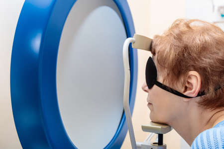 Perimetry eye test for early signs of glaucoma in women at an ophthalmology clinic, measuring full eyesight including peripheral vision