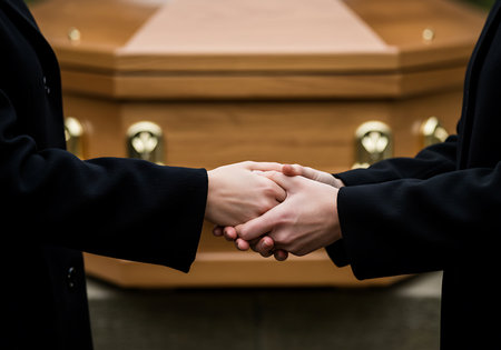 Two people holding hands in a moment of shared grief and support at a funeral. Generative Ai