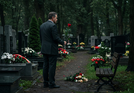 A man in a dark suit stands in a cemetery, holding a red rose, paying respects at a grave. Generative Ai