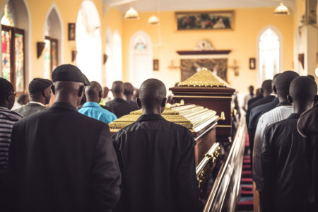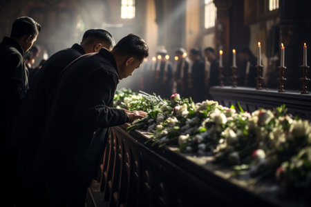 A poignant shot of a religious funeral ceremony, showcasing the rituals, prayers, and mourners coming together to pay their last respects. Generative Ai