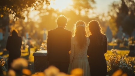 Grieving family hugs together at cemetery. Generative AI.