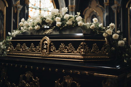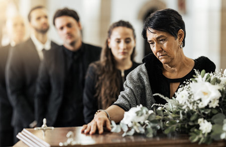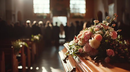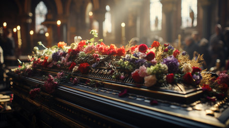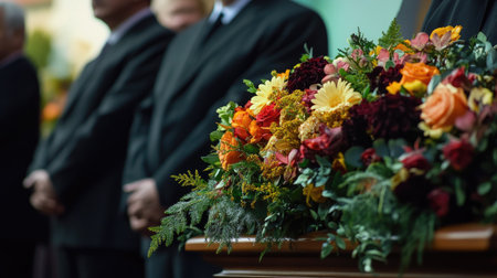 Emotional farewell at a funeral service with a beautifully arranged floral tribute on a polished wooden casket in a solemn atmosphere