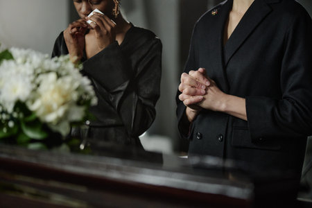 Black woman and Caucasian woman standing at coffin, Black woman holding tissue near face appearing emotional, Caucasian woman clasping hands together, funeral flowers in foreground
