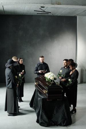 Group of middle aged and young adult multiethnic men and women standing around closed casket holding roses during funeral ceremony, priest reading from book nearby