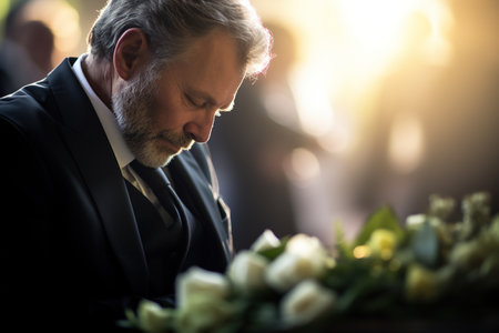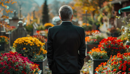 Respectful man mourning by standing solemnly amidst colorful flowers